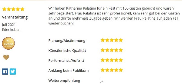 ...unkompliziert und offen in der Abstimmung, dezent und zurückhaltend während des Auftritts.... Katharina Palatina begeisterte mit ihrem modernen Saxophon-Spiel und ihrem Gesang, sowohl bei der Untermalung des Festakts, als auch durch ihre Hintergrundmusik während des Empfangs (Amtseinführung mit Steh-Empfang, ca. 50 Gäste).